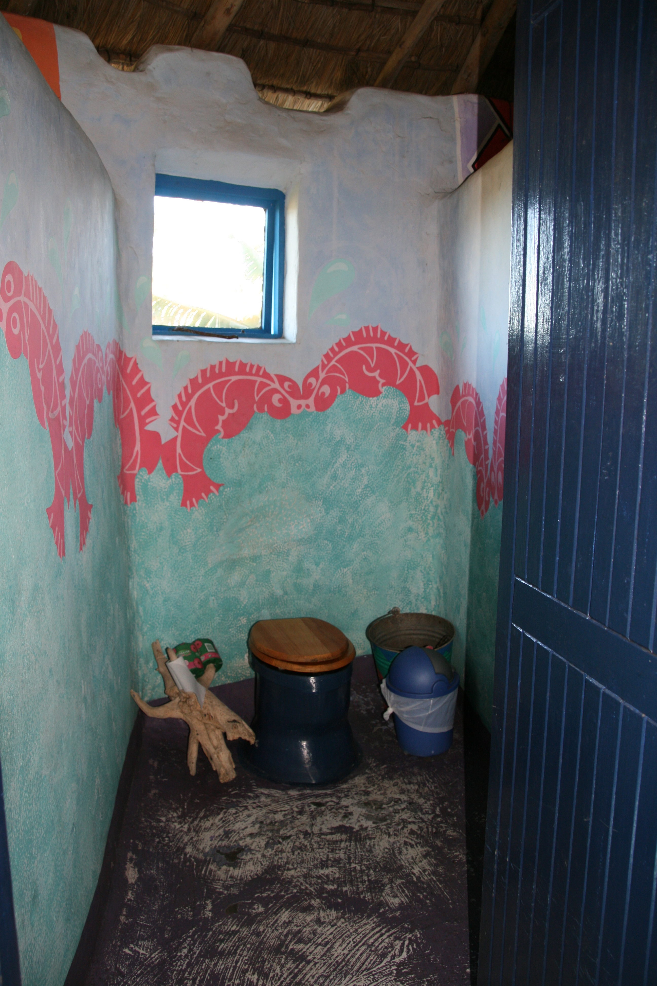 The door of another hut opened to bright colors and murals of turtles, frogs, flowers and fish, each of six stalls personalized by its own mural in yellows, greens, oranges, blues, purples, pinks and reds. Each stall contained a composting toilet, a bucket of dirt and a shovel and driftwood holding a roll of toilet paper. The instructions on the back of the door told us what to do. These toilets were simpler than the composting toilets I’ve seen in the U.S., but the dirt covered the smell, so odors were not offensive. These were the only composting toilets we encountered in South Africa.