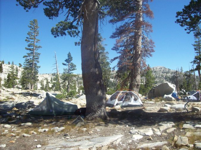 With its plentiful campsites, several small beaches and its clear, blue water, Gem Lake is a popular destination; and while we found the lake idyllic, others did too. Their tents hidden behind boulders and lodgepole pines, we caught an occasional flash of red or green and heard swimmers yell as they dove and swam, a dog barking excitedly.