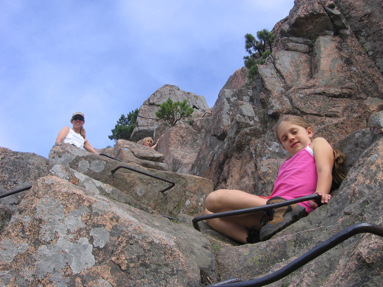 We began to walk up the trail, pausing to read the sign. “Caution!” it warned. My husband and I looked at each other. Were we doing the right thing? We took a photo of the sign and continued as the trail turned from an easy meander to rock scrambling, boulder stepping, and hand grasping. The trail wasn’t as bad as I had feared. I followed my son with my daughter behind me, occasionally catching glimpses of my husband’s worried face below.  The kids were doing fine and seemed to enjoy the challenge of the mountain. We crossed the narrow iron rung bridge climbing the iron rungs up the pink granite as we would a ladder. Only 30 minutes later, we stood at the top, ready to take our photo with the town newspaper, my husband visibly relieved that it was over, I amused that the elevation was only 542 feet.