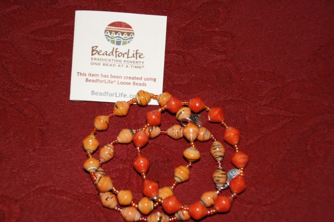 I bought recycled bead bracelets made in Uganda from BeadforLife. Bead for Life teaches women the art of bead making as well as entrepreneurial and business skills so that they may successfully run their own sustainable business once they graduate.