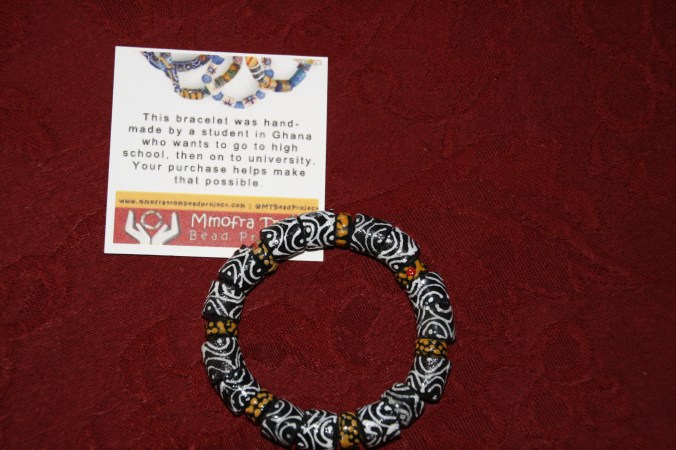 I bought a bracelet for myself from the Mmofra Trom Bead Project whose motto is “Give the gift of education, one bracelet at a time.” Children in Ghana string beads made from recycled glass to help fund their high school and college education. The beads are made by local Ghana artisans.