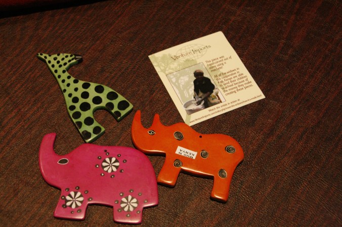 IMG_0814I gave animal shaped ornaments made from soapstone to my family to hang on our tree. Venture Imports sells these ornaments and other carvings which are cut with machetes by Kenyans as part of the Tabaka project. Tabaka was established to eradicate suffering throughout the Kisii area of Kenya and provide an opportunity for a better quality of life by providing fair wages and the ability to market products outside of Kenya.