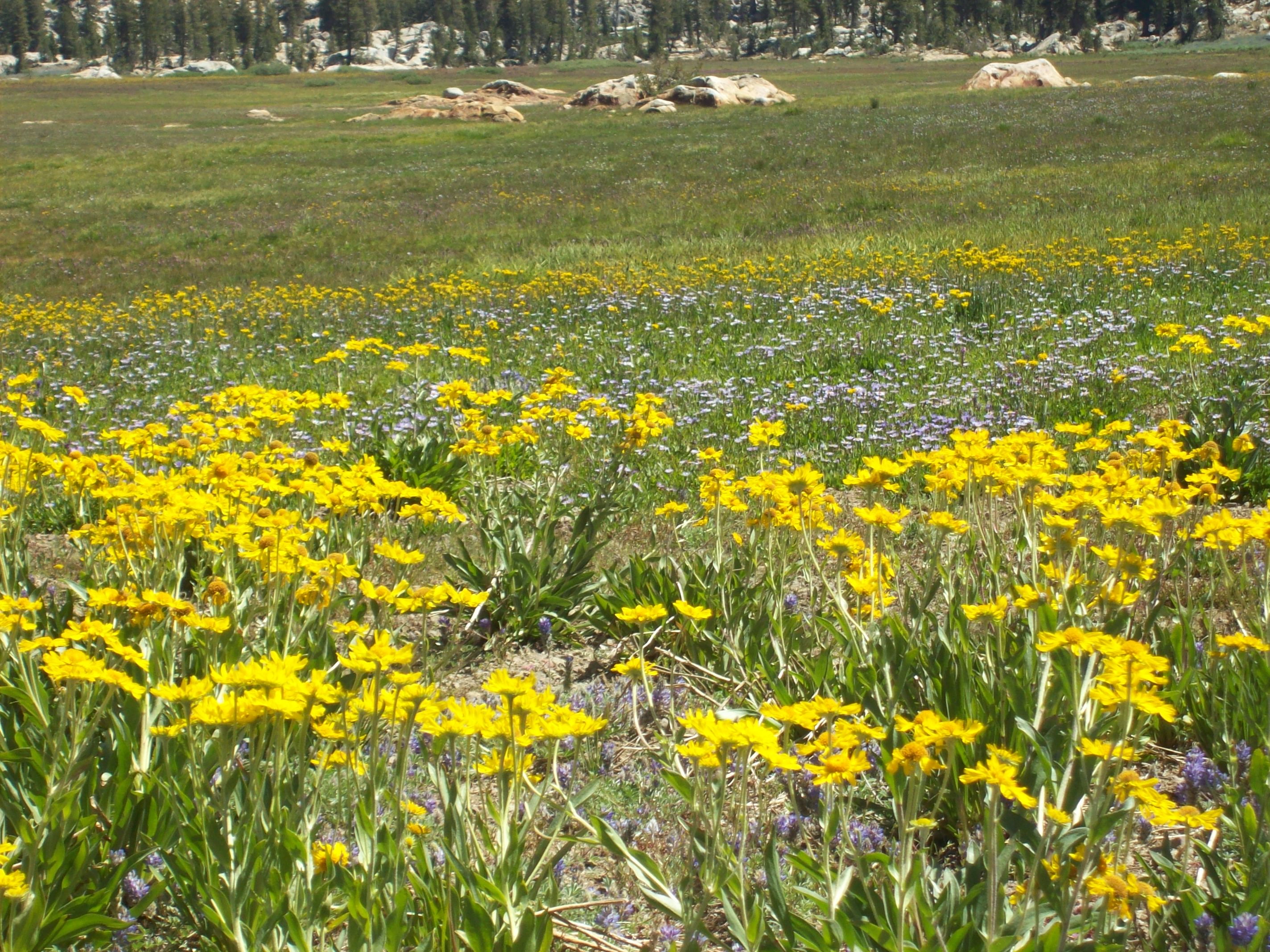 Our longest day was one of our easiest, as the 7 miles of trail wandered and wound through meadows of wildflowers:  blue lupine, red Indian paintbrush and yellow monkey flowers.